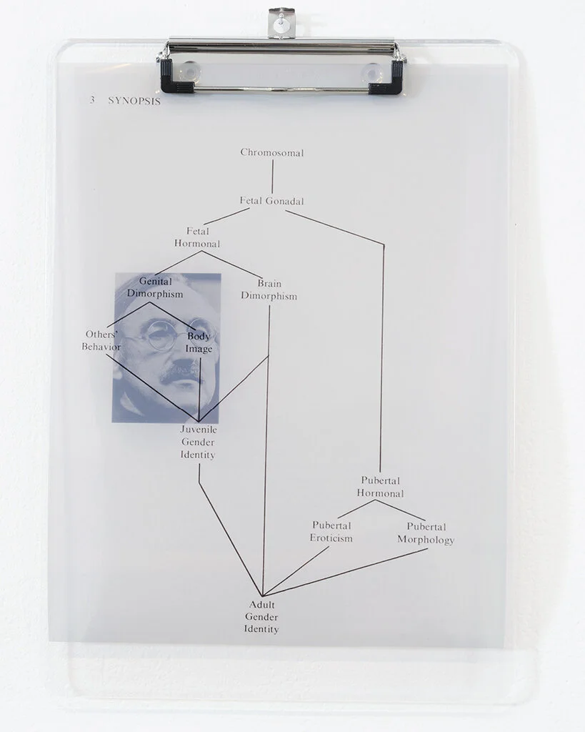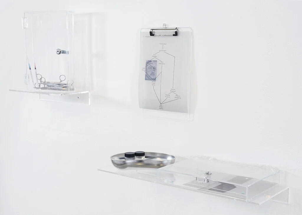Dimensions variable | acrylic clipboard, locking acrylic boxes filled with surgical supplies and selections from John Money’s book “Man & Woman, Boy & Girl” on transparent film, blue and pink syringes, Estradiol, kidney basin, acrylic shelves