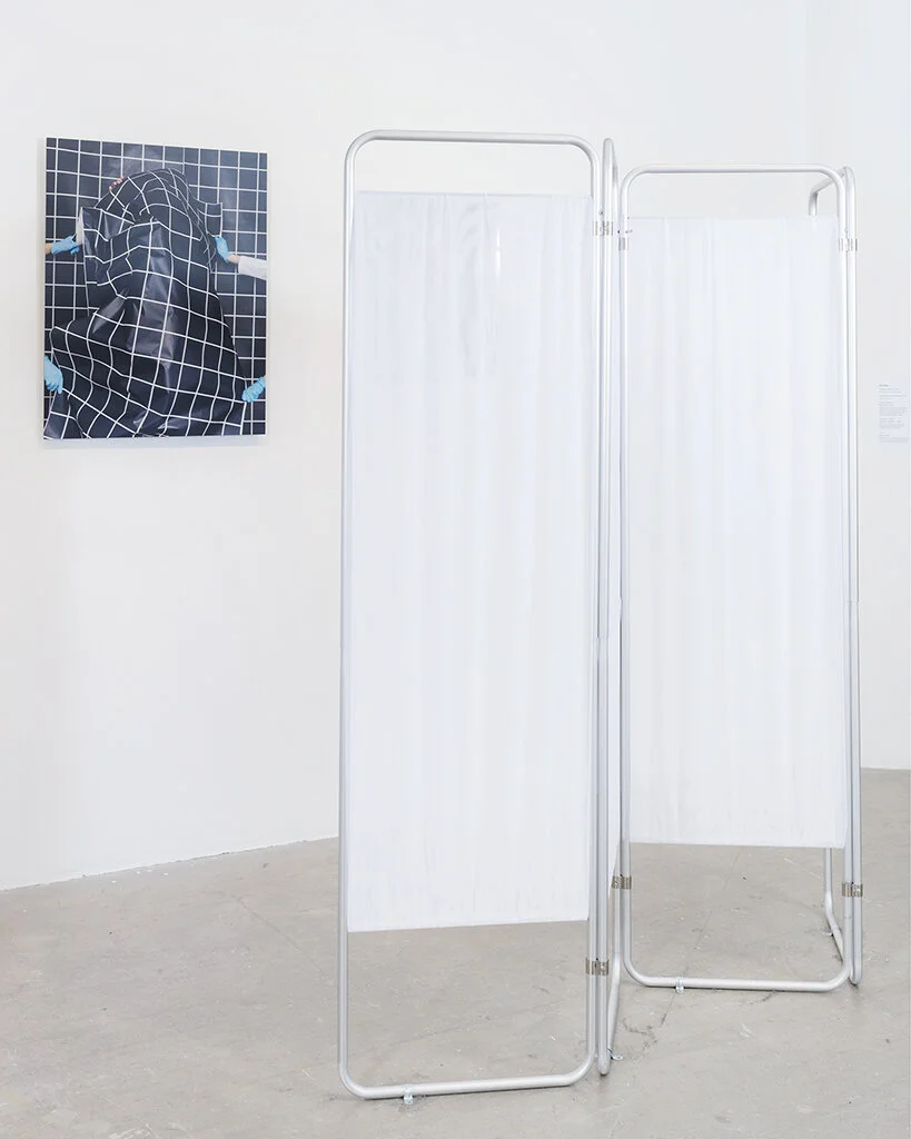 Dimensions variable | aluminum hospital screen with sheer tulle panels, USB with audio recording of artist reading “The Medical Construction of Gender” by Suzanne Kessler outside of a hospital